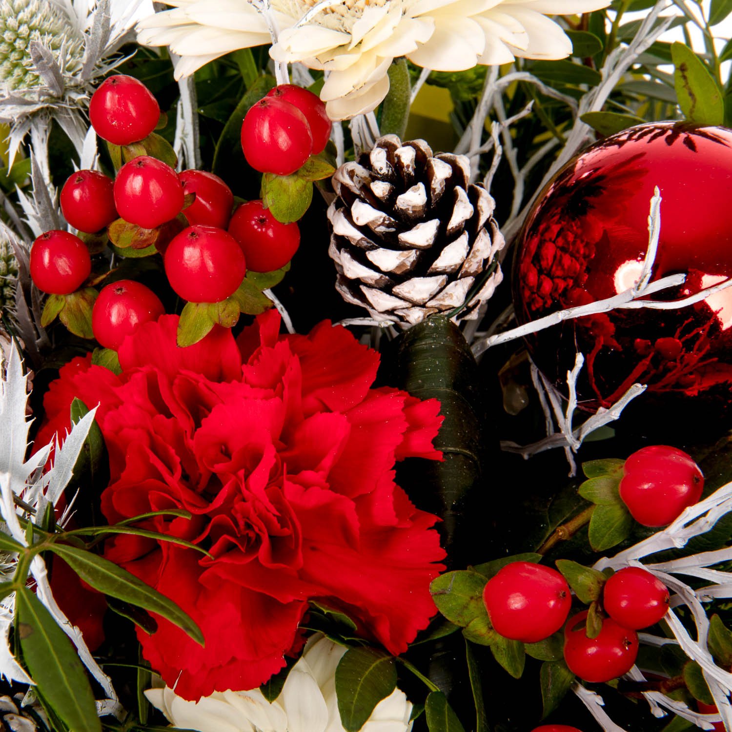 Carnations, Mini Gerberas, Santini Chrysanthemums, Eryngos, Hypericum, Sleeve & Decorative greenery (11 stems)