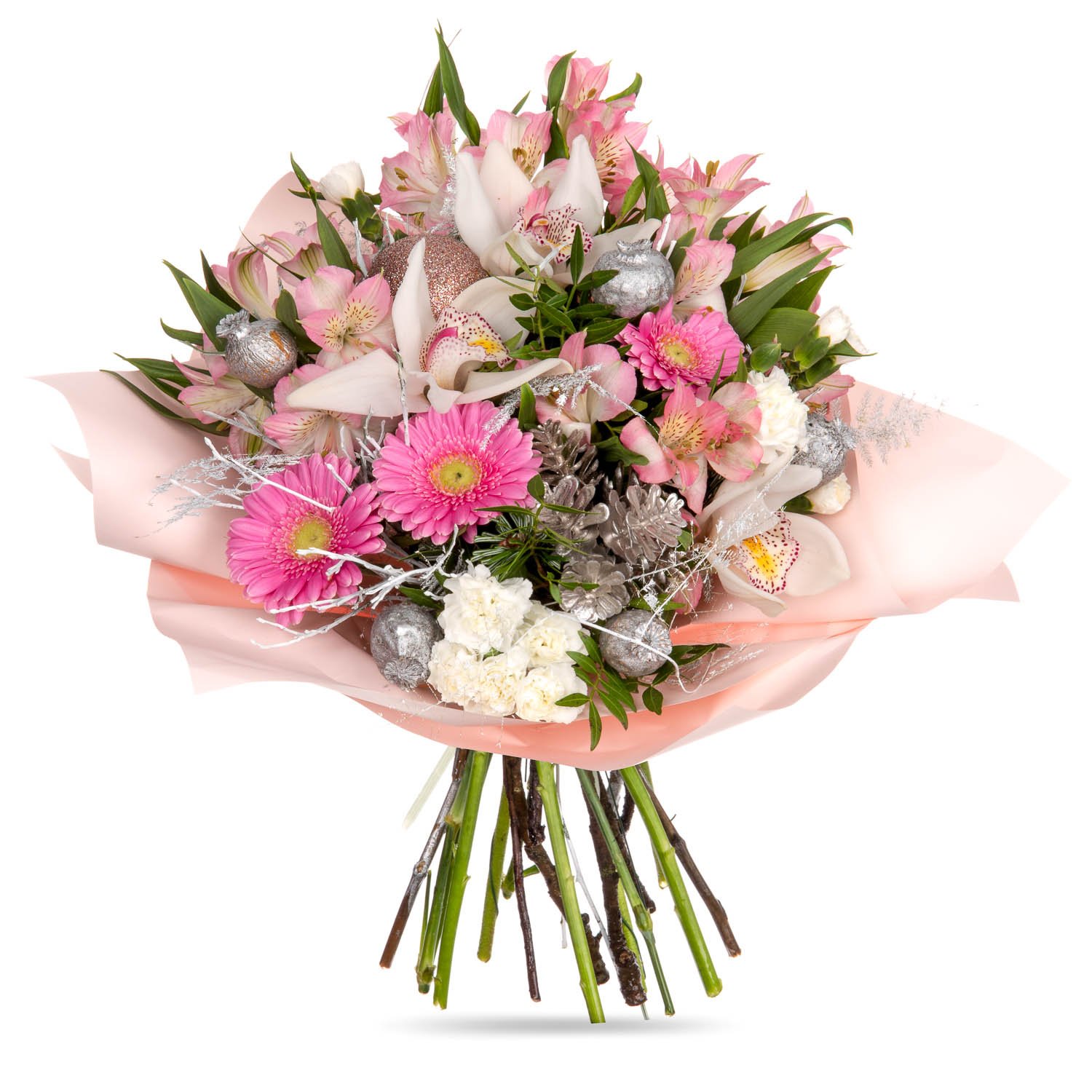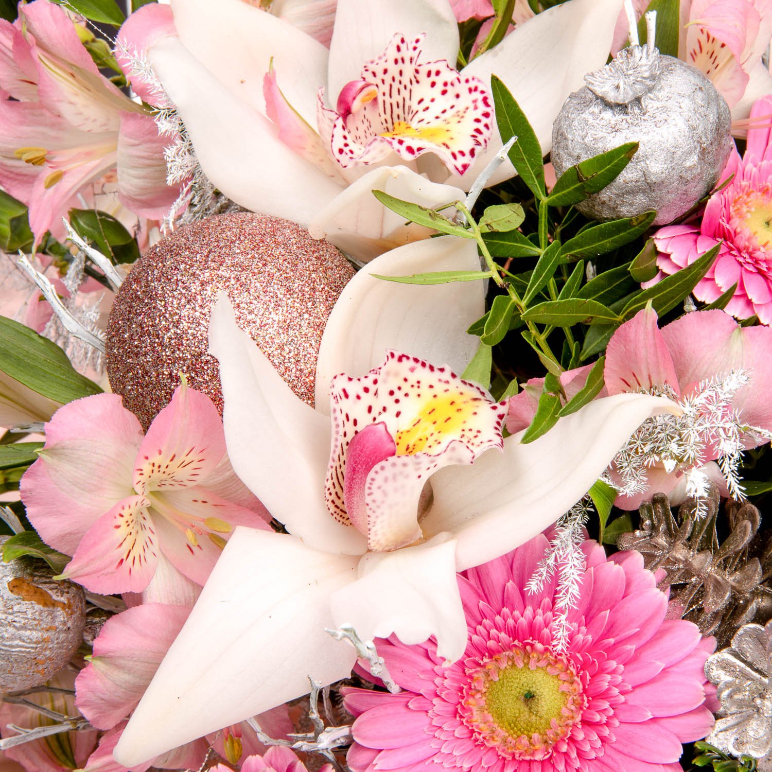 Orchid blossom, Bush Carnations, Alstroemerias, Mini Gerberas, Decorative bow, Sleeve & Decorative greenery (15 stems)