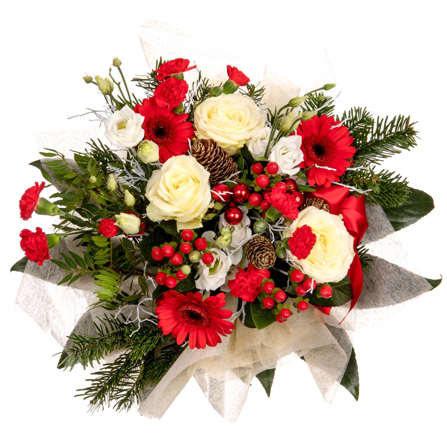 Bush Carnations, Roses, Lisianthus, Mini Gerberas, Hypericum, Decorative bow, Sleeve & Decorative greenery (17 stems)