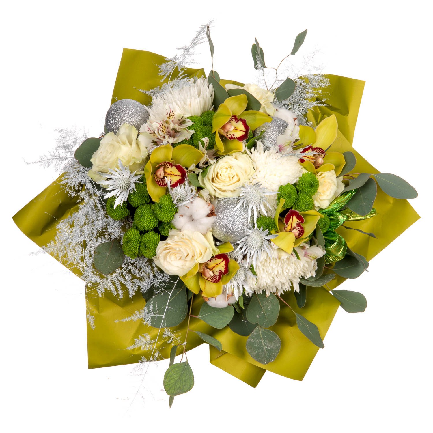 Orchid blossom, Cotton, Eryngos, Alstroemerias, Roses, Single Bloom Chrysanthemums, Santini Chrysanthemums, Decorative bow & Decorative greenery (25 stems)