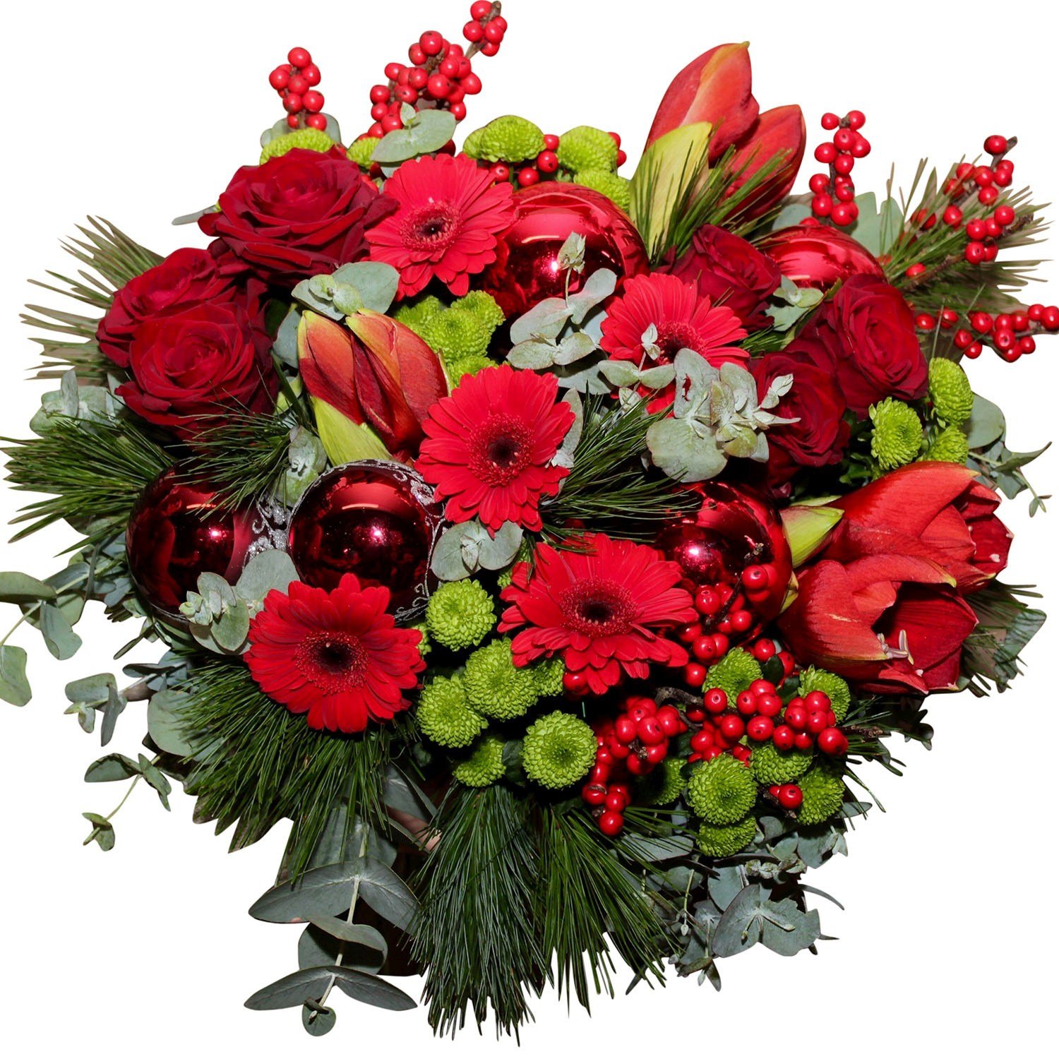 Roses, Mini Gerberas, Amarillos, Ilexes, Santini Chrysanthemums, Christmas green fillers, Christmas decorations & Decorative greenery (27 stems)