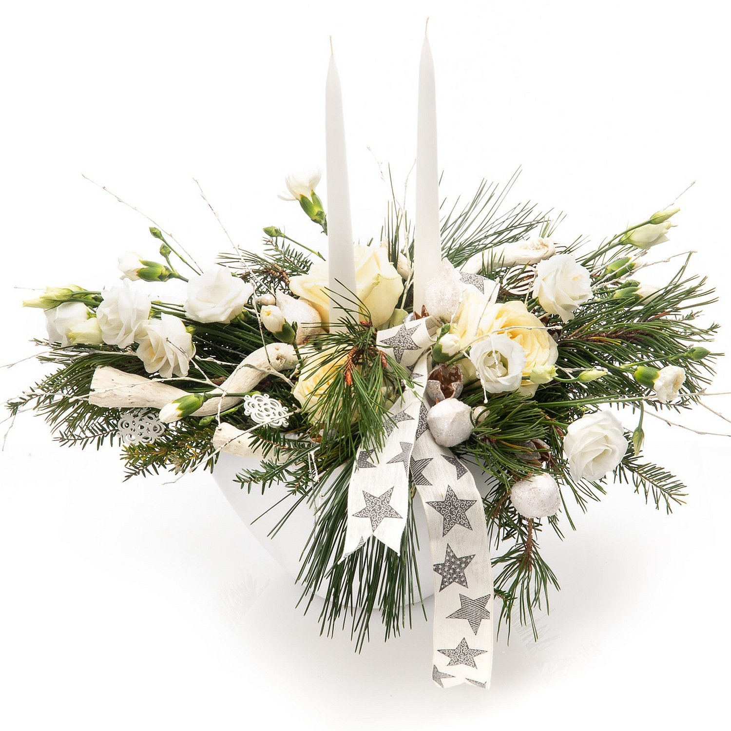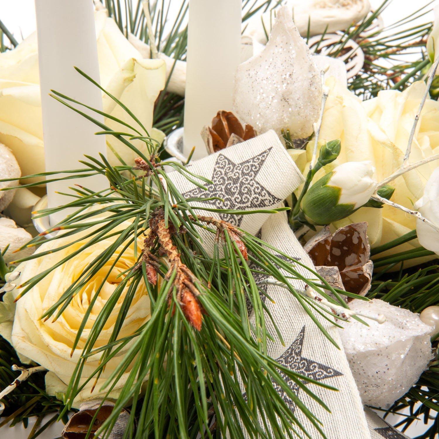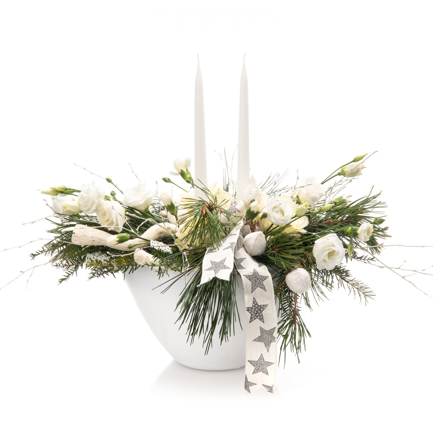 Roses, Lisianthus, Bush Carnations, Ceramic container, Christmas decorations, Christmas green fillers & Decorative greenery (15 stems)