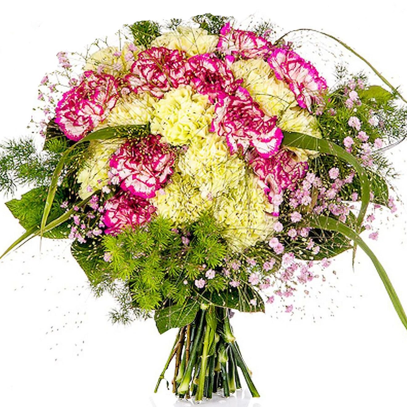 Exkluzivní | 19 ks karafiátů, 3 ks gypsophila a dekorativní zeleň (asparagus umbelathus, pistacie, bear grass, salal) |