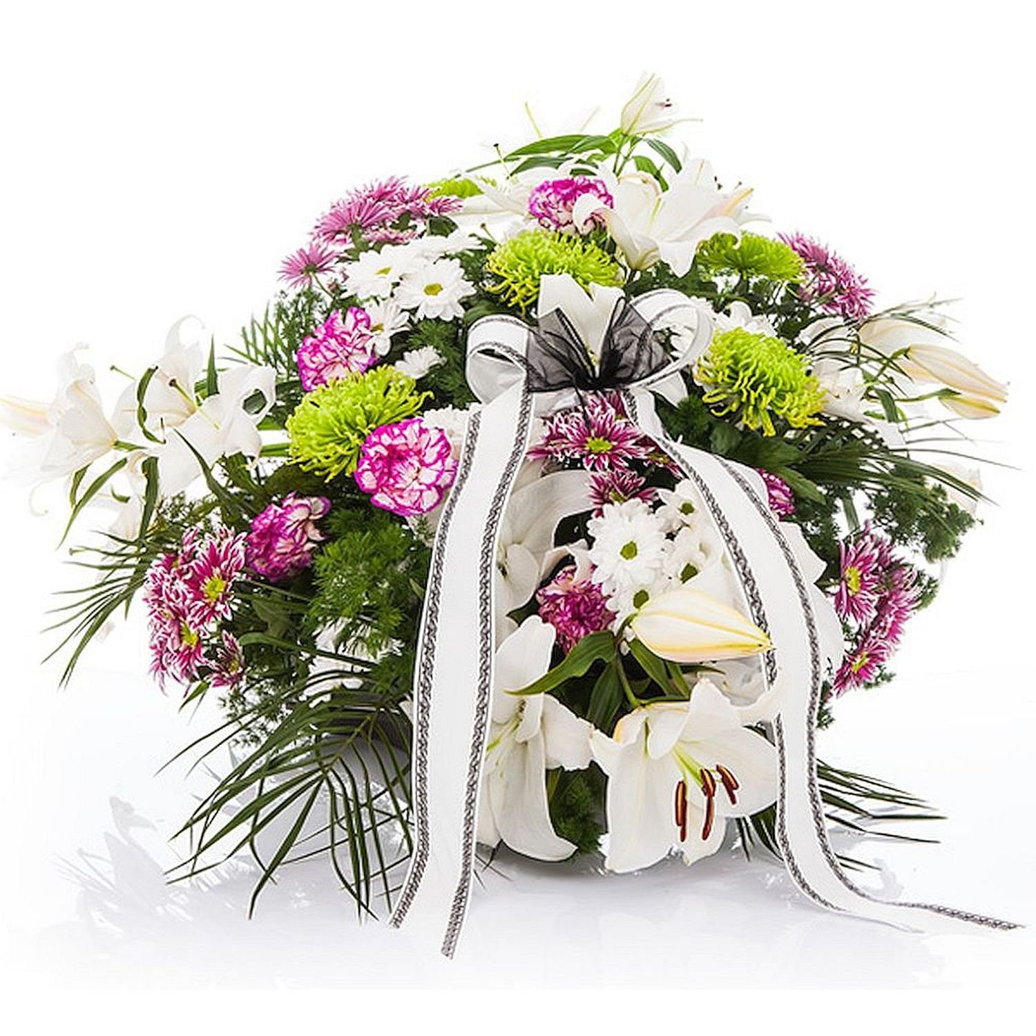 Velká Vypichované aranžmá, 8ks chrysantéma, 3ks královská lilie, 4ks jednokvětá chrysantéma, 4ks karafiát, florexová hmota,dekorativní zeleň (italský ruscus, robelini, chvojí) a smuteční stuha
