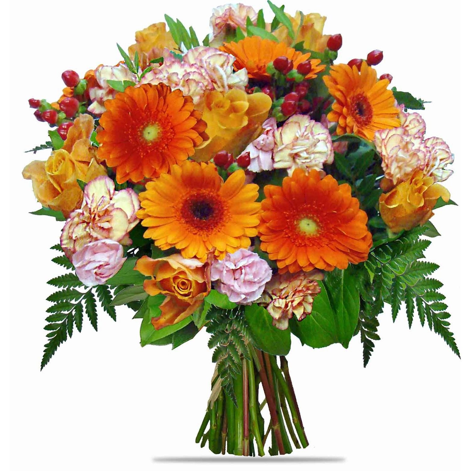 5 ks růže, 5 ks mini gerbera, 5 ks karafiát, 4 ks hypericum a dekorativní zeleň