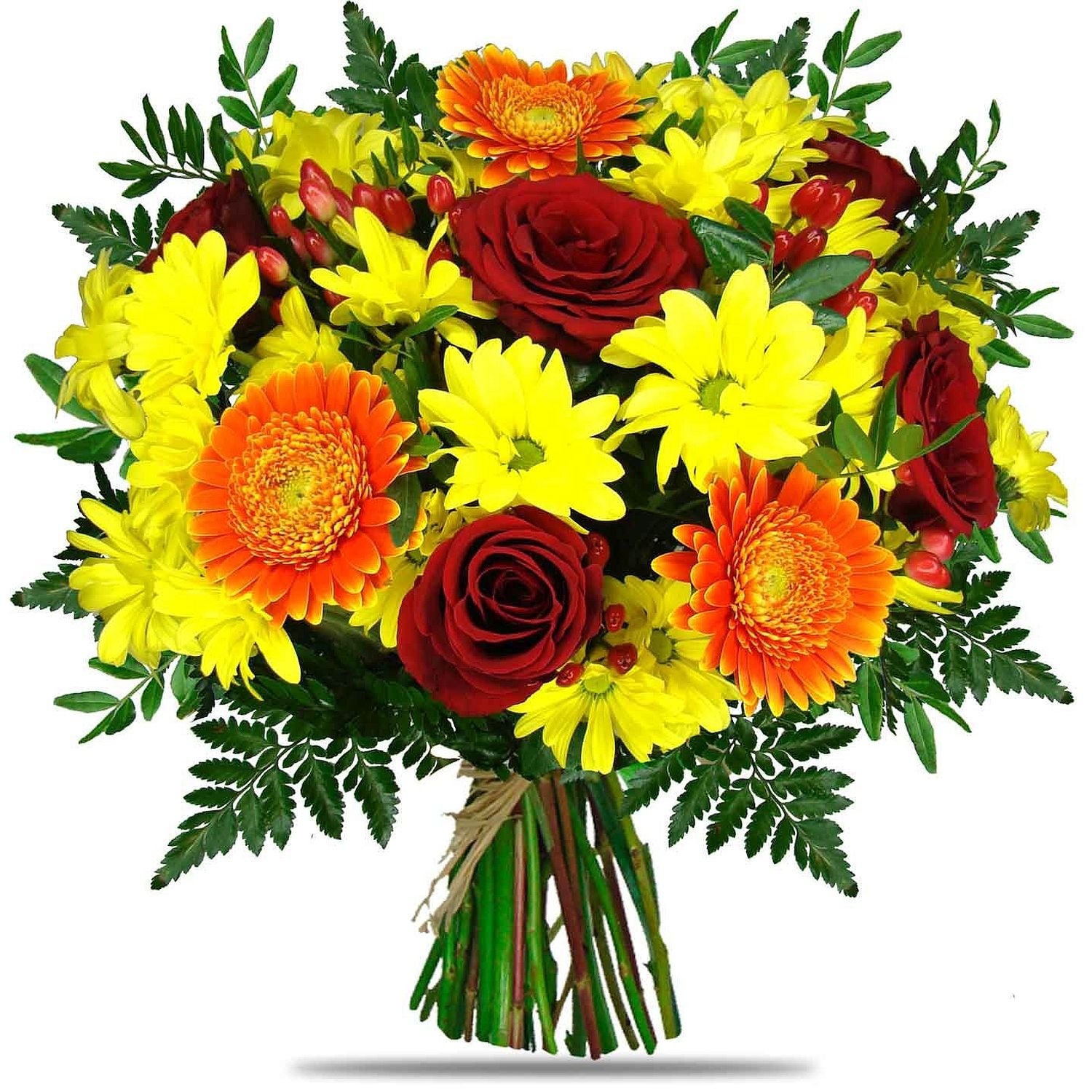 Standardní 2 ks chrysantéma, 3 ks růže, 3 ks germína, 2 ks hypericum a dekorativní zeleň