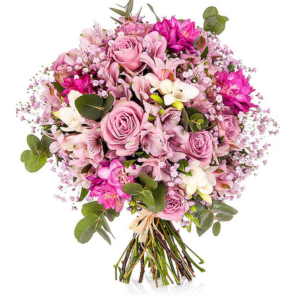 Standardní 3 ks alstromerie, 3 ks růže, 3 ks frézie, 1 ks gypsophila a eukalyptus