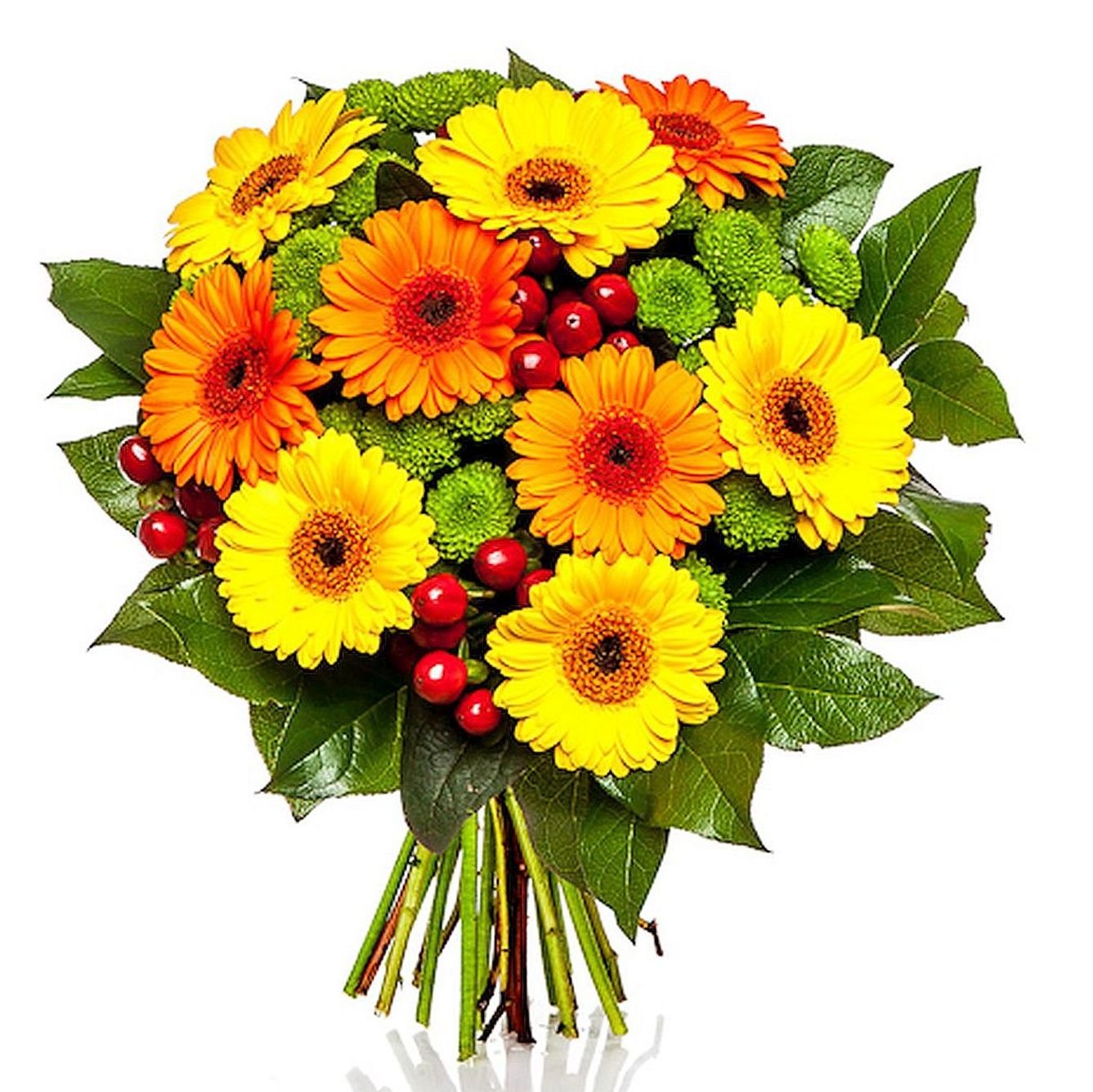 Standardní 5 ks gerbera mini, 3 ks santini, 2 ks hypericum a dekorativní zeleň (salal)