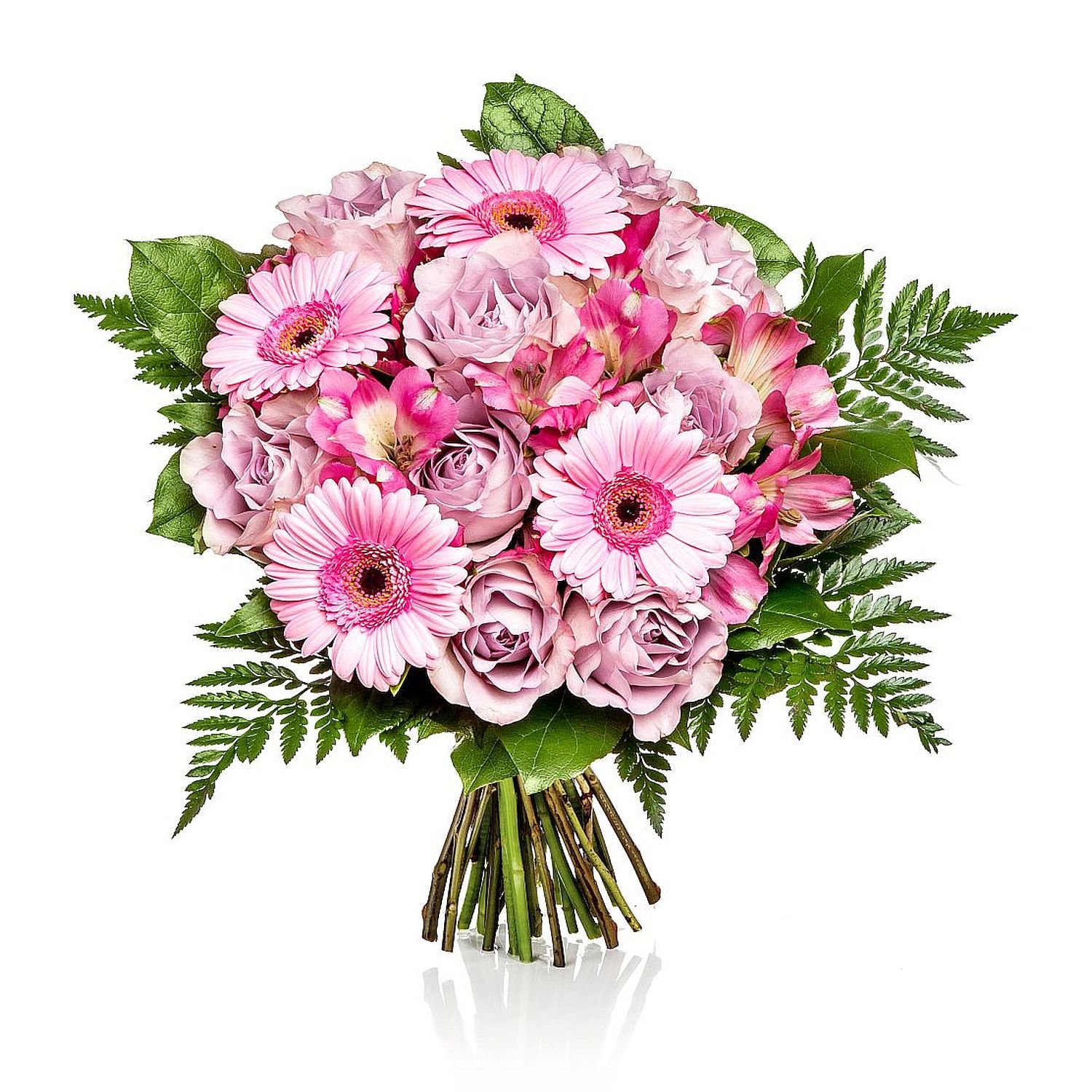 Standardní 5 ks růže, 2 ks germínka, 2 ks alstromérie a dekorativní zeleň (rumora pistacie, salal)