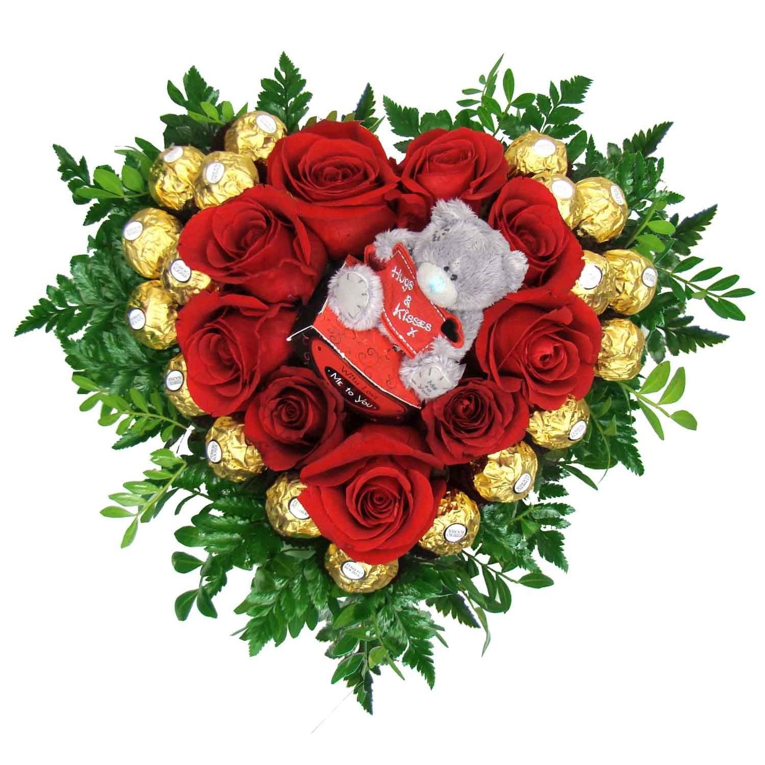 Vypichované srdce, 9 ks růží, 200g Ferrero Rocher, plyšový medvídek a dekorativní zeleň. Přibližná velikost 30cm x 30cm. Během letních měsíců může dojít k záměně za Ferrero Raffaello.
