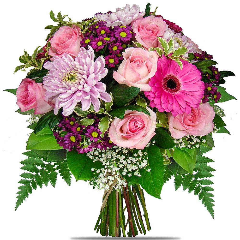 Velká 2 ks jednokvětá chryzantéma, 3 ks chryzantéma santini, 5 ks růže, 1 ks mini gerbera, 2 ks gypsophila a dekorativní zeleň