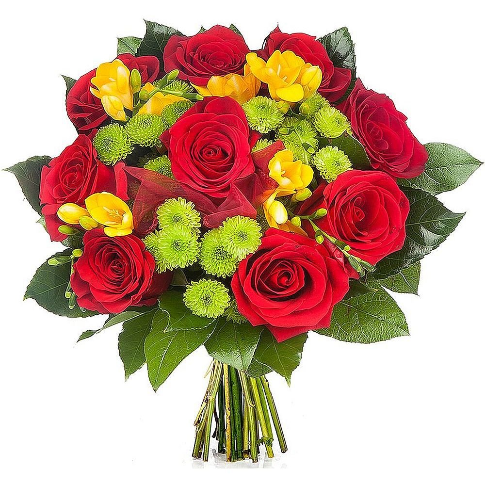 Exkluzivní 10 ks růže, 8 ks frézie, 5 ks chrysanthéma santini a dekorativní sezónní zeleň