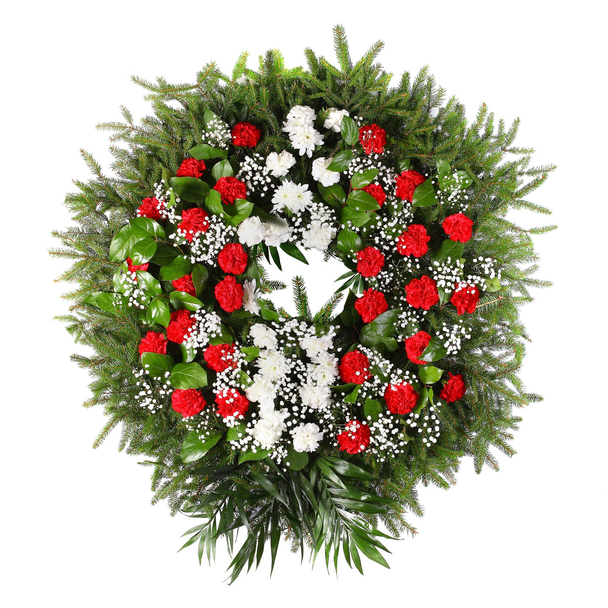 Standardní 14 ks karafiáty, 4 ks gypsophila, 5 ks chryzantéma, dekorativní zeleň a smuteční stuha. Velikost cca. Ø 50 cm