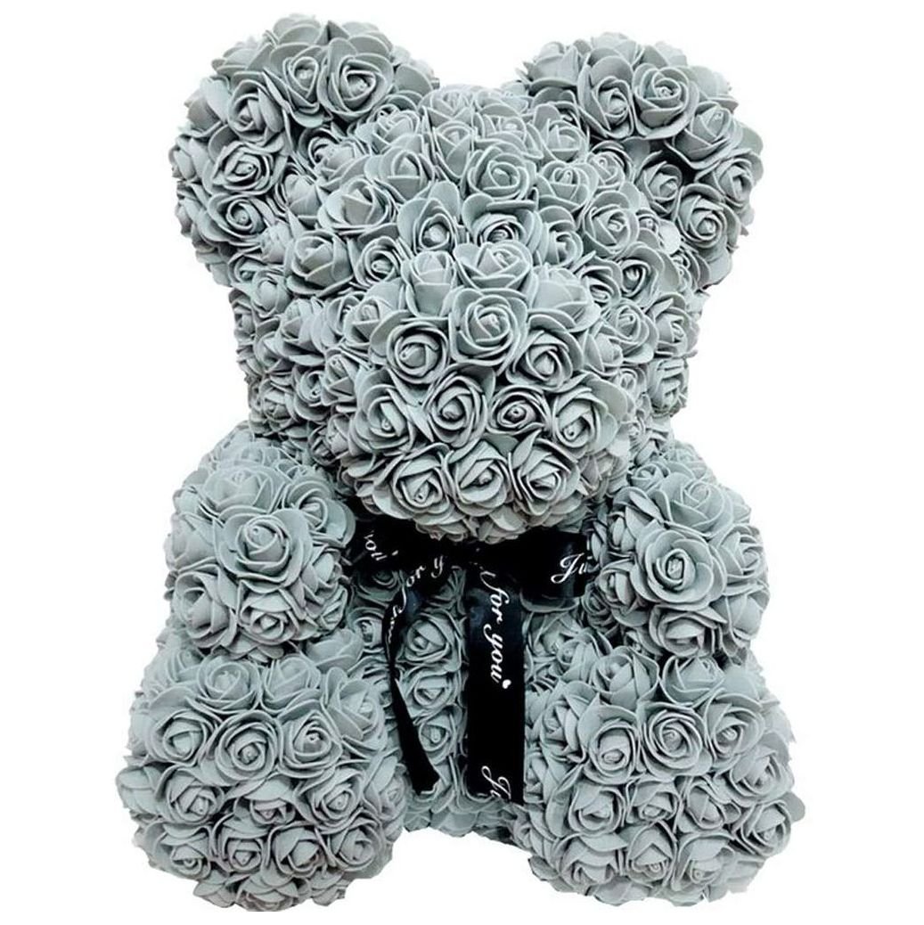 Šedý medvídek z růží o velikosti cca. 25 cm je výjimečný dárkový symbol moderní elegance a jemných emocí. Každý kus je vyroben z desítek drobných pěnových růžiček, které si uchovávají svůj tvar i barvu po mnoho let, nikdy neuvadnou a vždy potěší pohledem.