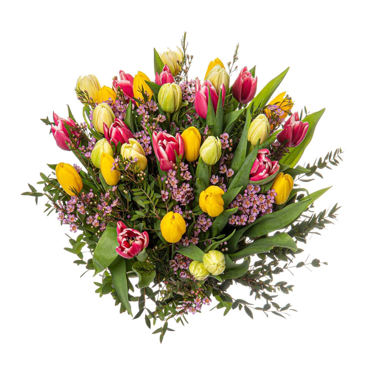 | Standardní | 5 ks tulipán růžový, 5 ks tulipán bílý, 5 ks tulipán žluty, 4 ks růžový/fialový wax, pistacie, eucalyptus a dekorativní zeleň |