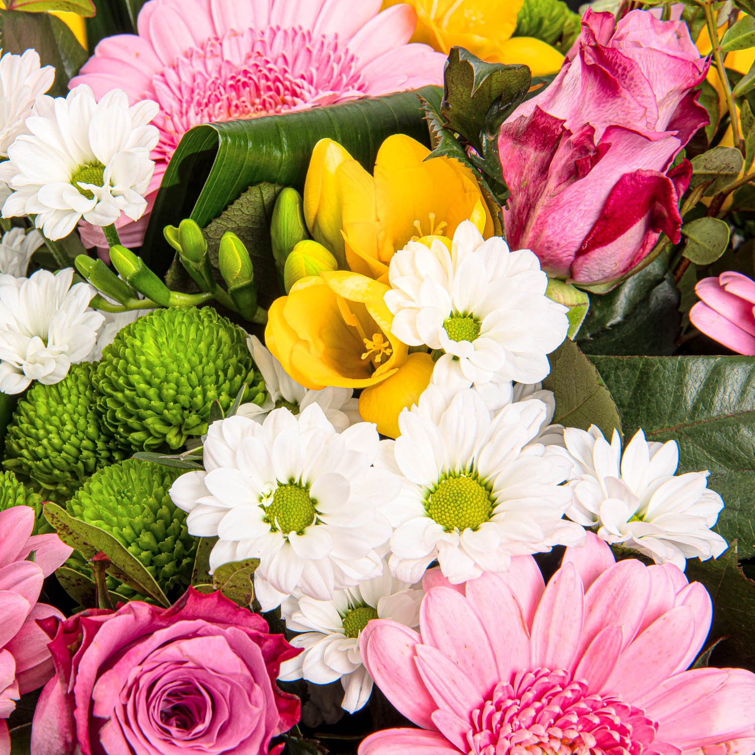 Standardní | 3 ks růže fialová/růžová, 3 ks gerbera mini růžová, 3 ks santini zelená, 3 ks santini bílá, 3 ks frésie a dekorativní zeleň (aspidistra, rumora, pistacie) |
