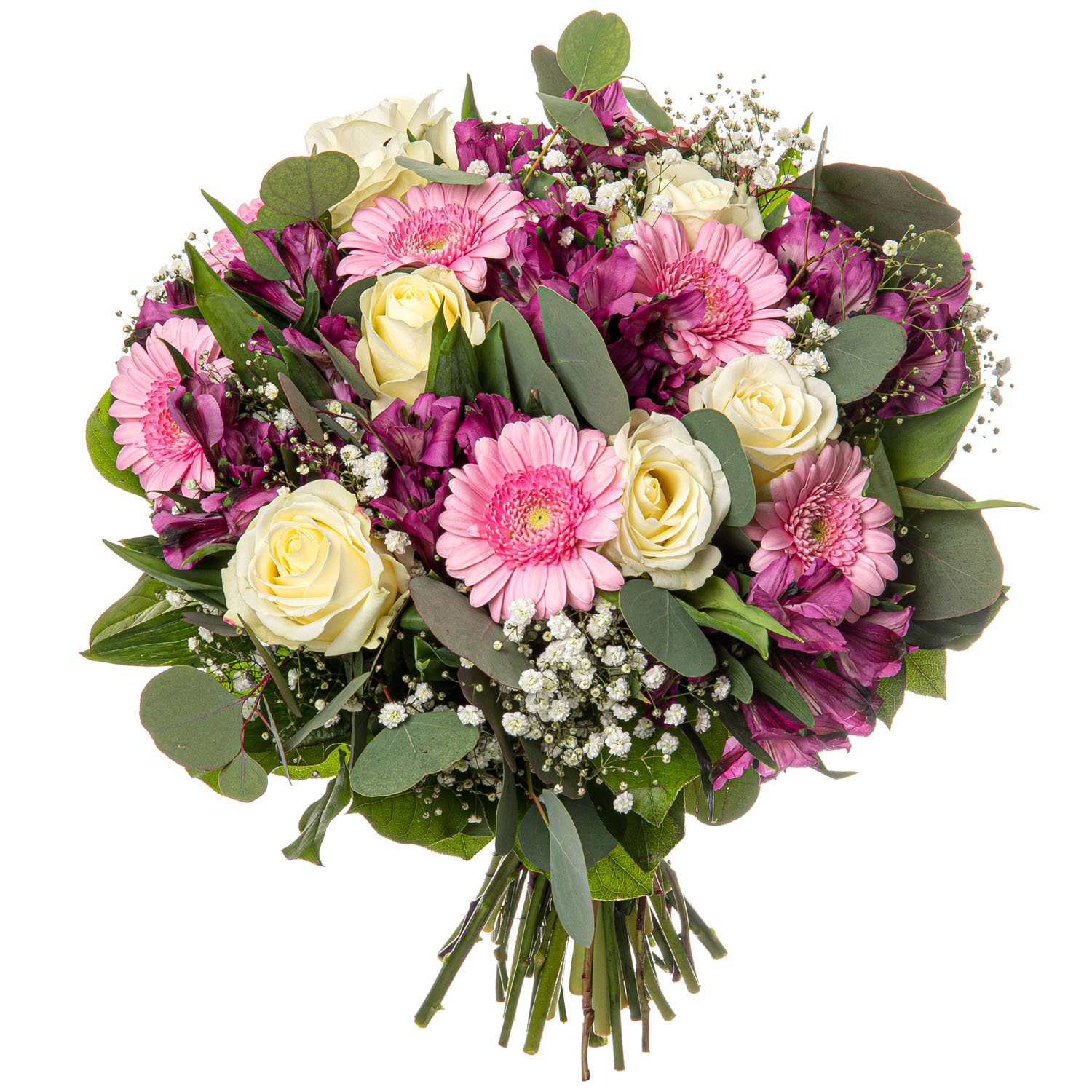 Standardní 3 ks růže, 3 ks gerbera mini, 3 ks alstromerie růžová/fialová, 3 ks gypsophila, eucalyptus a dekorativní zeleň (pistacie, salal)