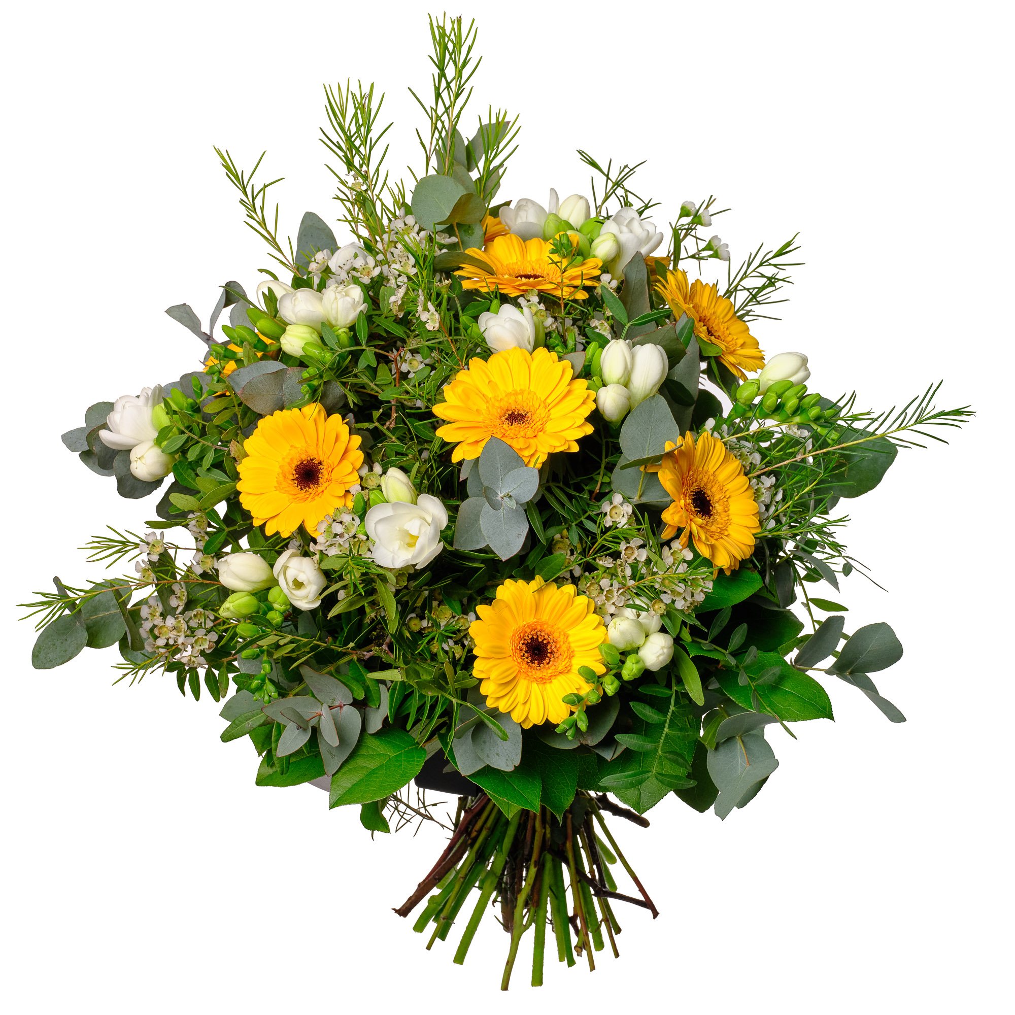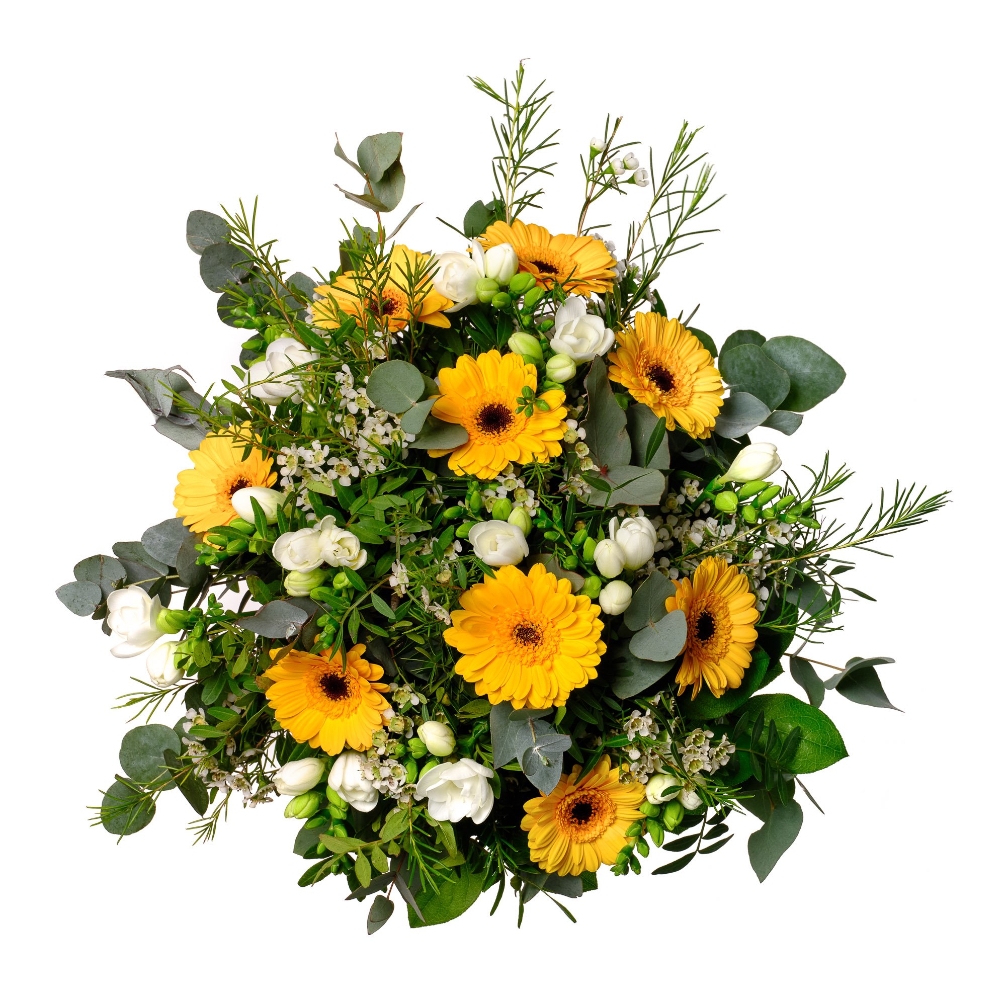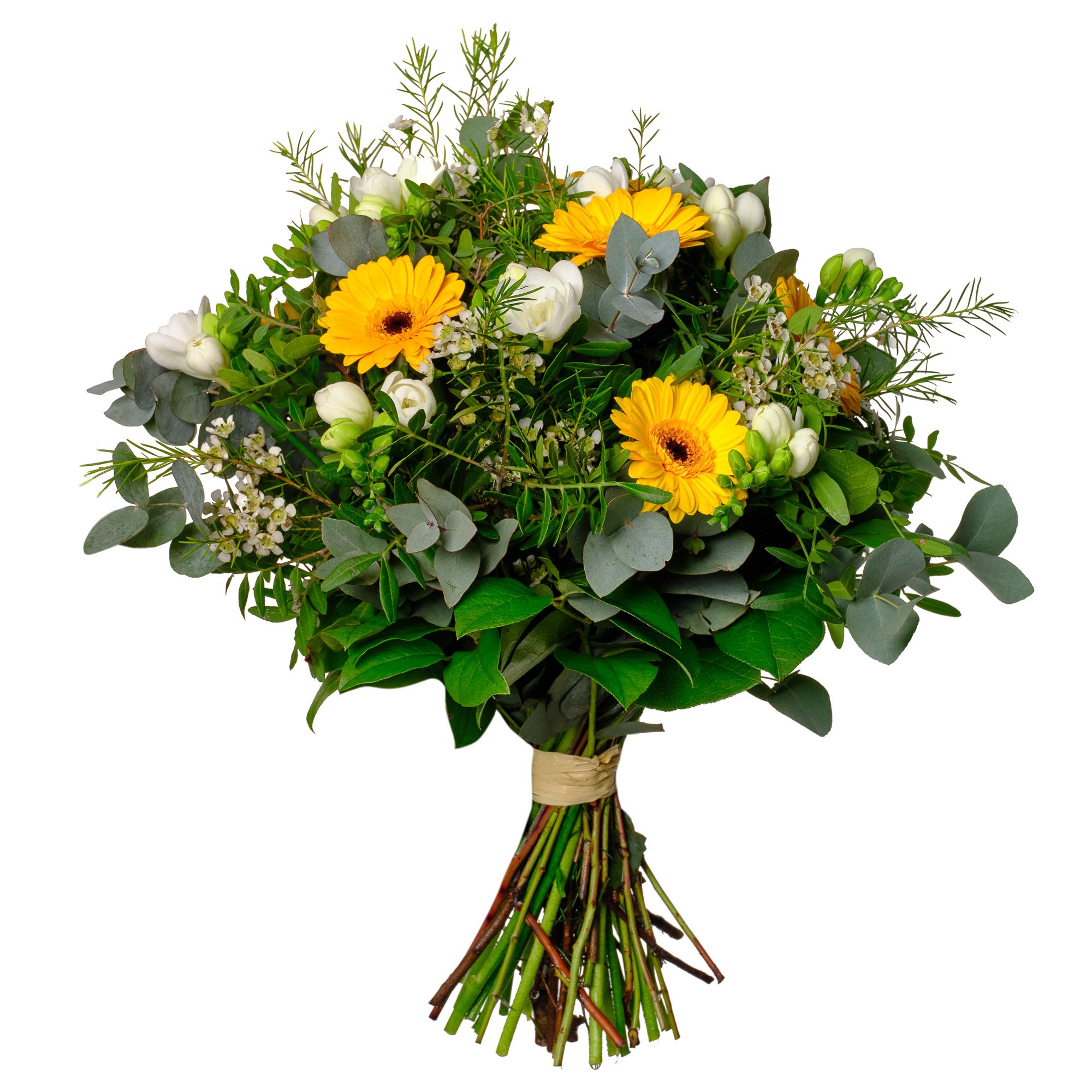 Exkluzivní | 9 ks gerbera mini, 12 ks frézie, 5 ks waxflower a dekorativní zeleň (pistacie, salal, eukalyptus) |