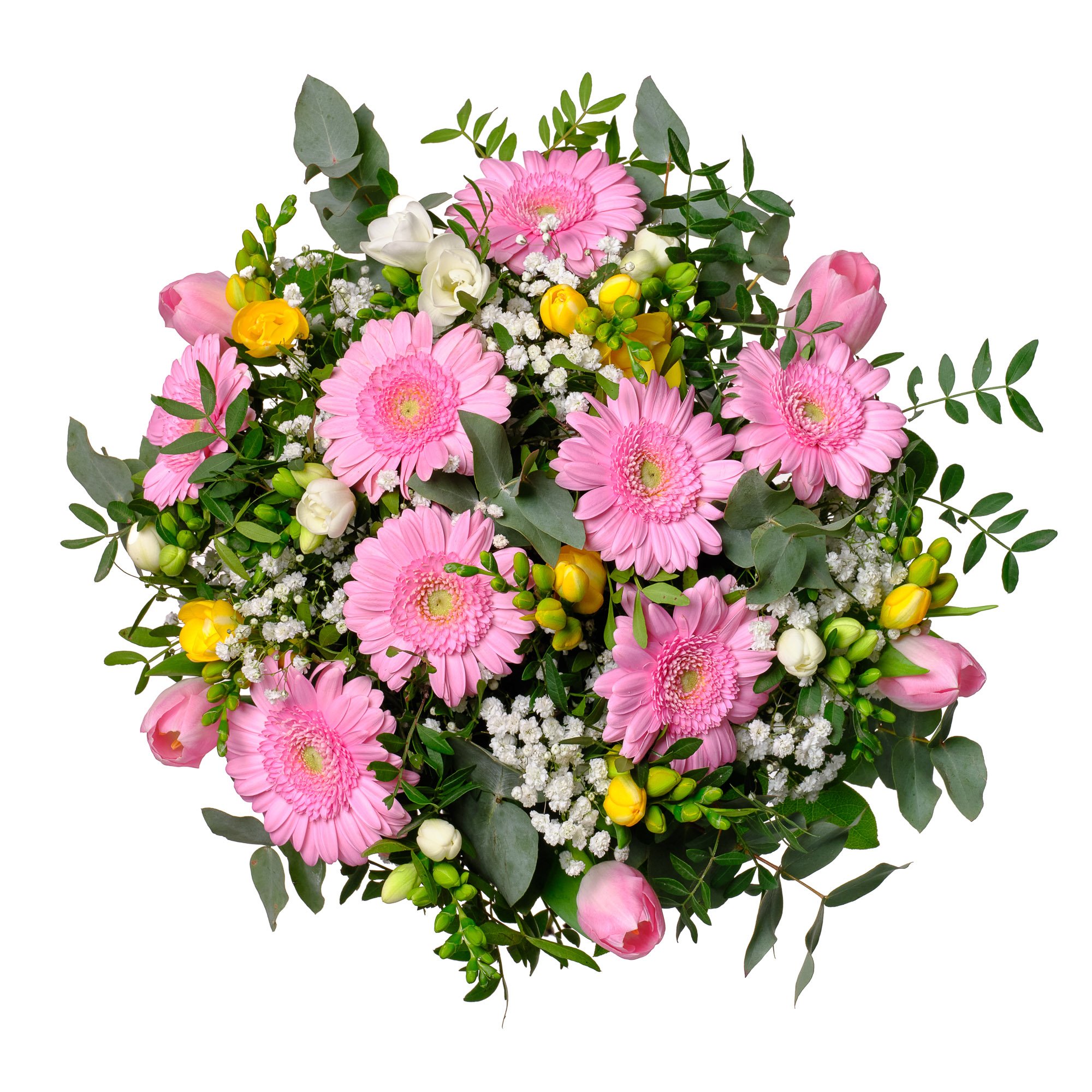 Standardní 3 ks růžová mini gerbera, 3 ks bílá frézie, 3 ks žlutá frézie, 2 ks gypsophila, 3 ks tulipán a dekorativní sezónní zeleň (pistacie, eukalyptus, salal)