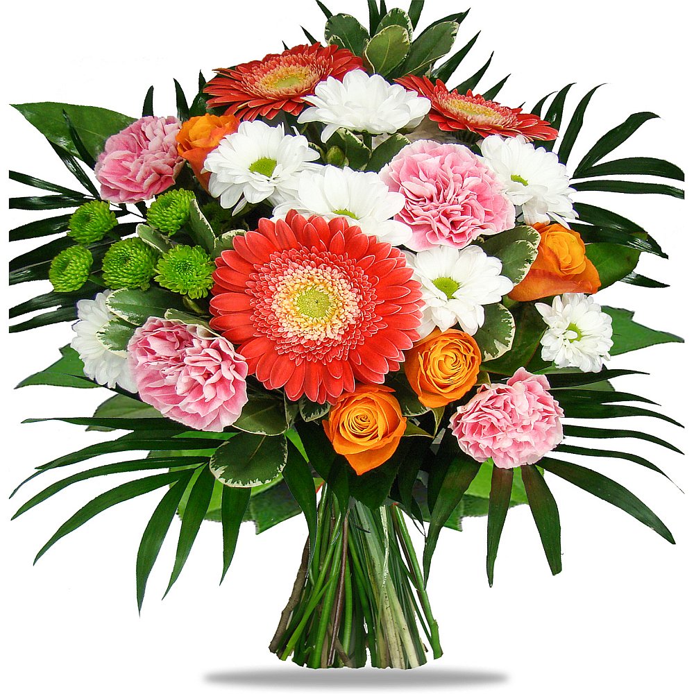 Velká 5 ks germína, 4 ks karafiát, 4 ks santini, 5 ks růže a dekorativní zeleň